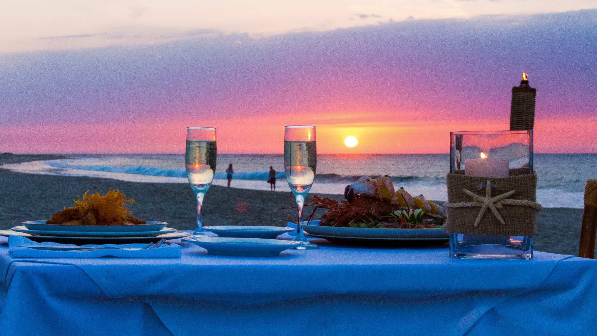 Premium: Cena en la playa para 2 personas, incluye armado, cena a la carta (Entrada + fondo + postre), como plato de fondo le incluye los especiales: Langosta, langostinos jumbo o carne angus + 1 botella de vino o cava.